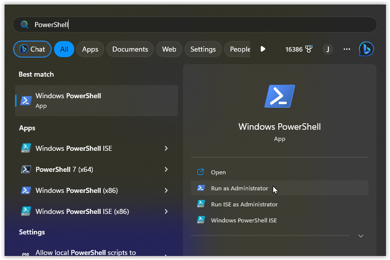 Type PowerShell and select Windows PowerShell (Run as Administrator)